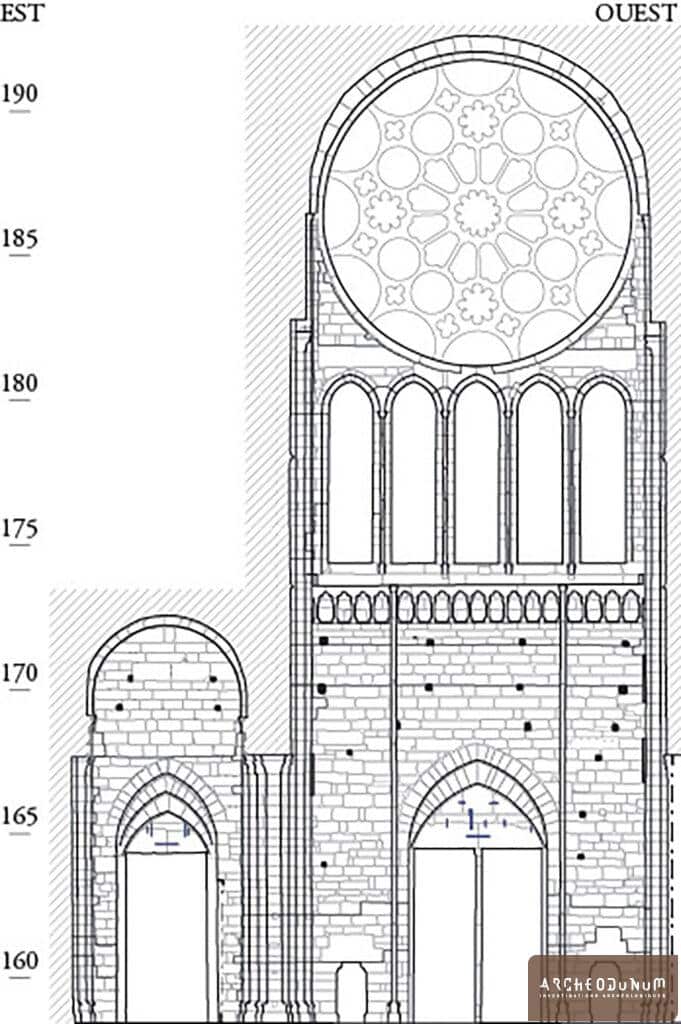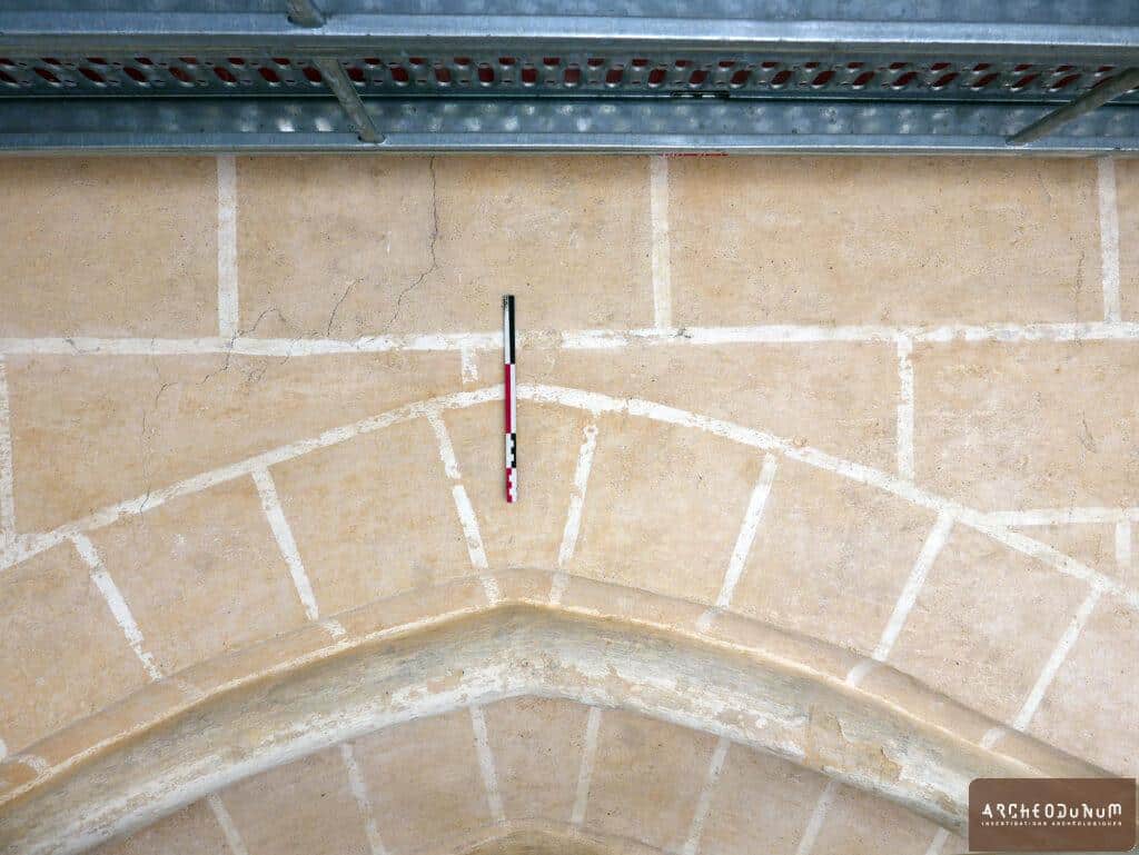 L’étude a porté sur les deux bras du transept, dont chacun est organisé en trois travées qui culminent à 33 mètres de hauteur sous voûte (fig. 2). Les archéologues se sont intéressées aux natures géologiques des pierres, confirmant le recours à trois types de calcaire qui avaient déjà été identifiés dans la nef de la cathédrale : pierre de Berchères, calcaire lutécien et calcaire crayeux. Ces matériaux, choisis pour leur disponibilité et leurs qualités constructives, sont assemblés à l’aide de mortier de chaux.