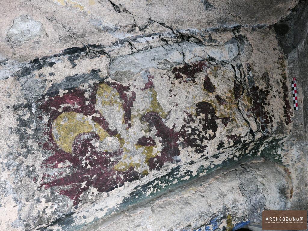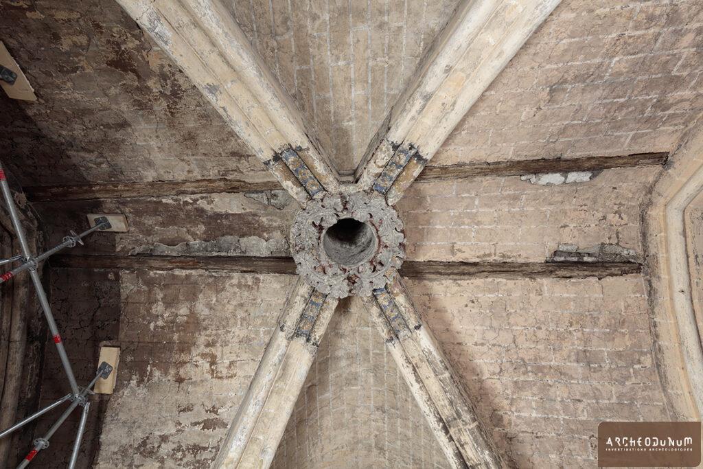 Les analyses des enduits révèlent l’ampleur du chantier de mise en décor qui a marqué l’achèvement du transept de la cathédrale, rapidement après le début de sa construction au XIIIe siècle. Chaque bras du transept était recouvert d’un enduit beige agrémenté d’un décor de faux-appareil peint en blanc (fig. 7). Moins d’un siècle plus tard, un nouveau motif de faux-appareil, cette fois sur fond rose-orangé, a recouvert le premier, tandis que les clefs de voûte recevaient un décor héraldique (fig. 8 et 9). Ce dernier n’a jamais été masqué, malgré les badigeons appliqués aux XVIIIe et XIXe siècles.