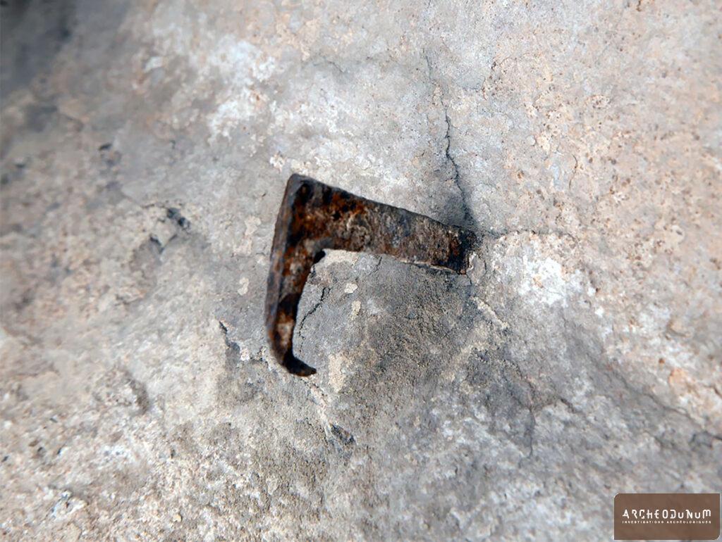 L’étude des maçonneries a révélé l’usage discret, mais omniprésent, du métal. Des tiges et agrafes en fer, scellées au plomb, assurent la cohésion des colonnes, des garde-corps et des remplages. En plus de ces éléments constructifs, de nombreuses réparations employant du métal ont été réalisées pendant le chantier, indiquant que des pierres ayant été cassées sont tout de même utilisées dans les murs (fig. 5). Cette particularité témoigne de la rapidité du chantier de construction du transept. Par ailleurs, le métal était aussi fiché dans les murs pour accrocher le mobilier liturgique ou, tout en haut des murs, pour fixer des protections temporaires devant les vitraux (fig. 6a et 6b).